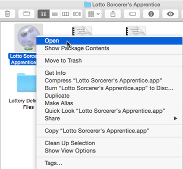 To start Lotto Sorcerer's Apprentice, you will need to control-click on the Lotto Sorcerer's Apprentice's icon (located in the folder called "Lotto Sorcerer's Apprentice", which is located in your Applications folder), which will present a contextual menu. On that menu, choose "Open":