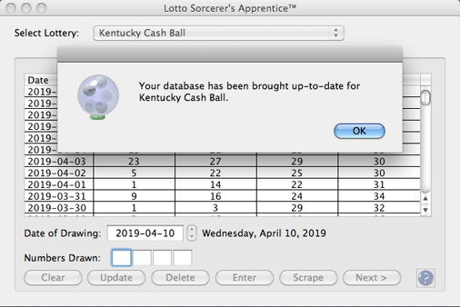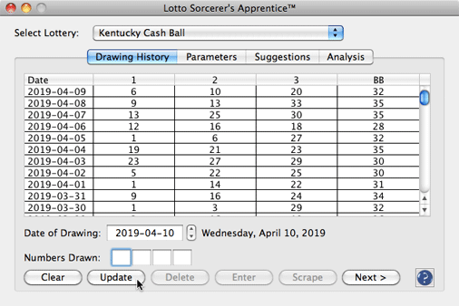 This tutorial assumes that you are a subscriber to the optional Lottery Data Service. If you are not a subscriber, you can start a subscription by using Lotto Sorcerer's Apprentice's menu item "Lottery Data > Lottery Data Subscription > Start Subscription".