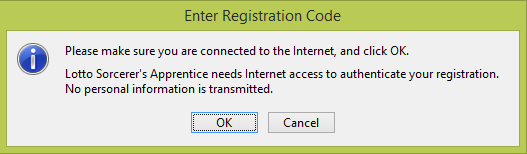 At this point, a window should open, advising you that Lotto Sorcerer's Apprentice needs access to the Internet to authenticate your registration. Click the OK button:
